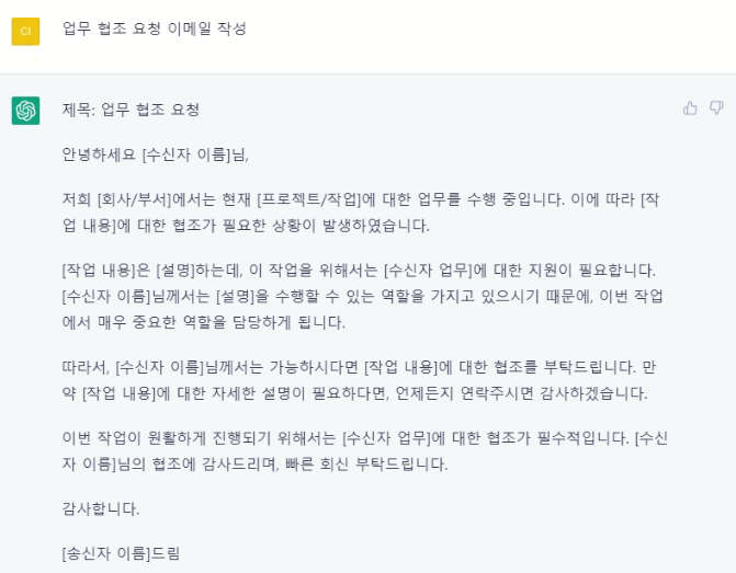 업무 협조 요청 이메일 작성에 대해서 요청하면 기본적인 형식에 대해서 자세하게 작성해 줍니다. 좀 더 디테일하게 필요한 정보를 입력하면 그에 따라 다양한 답변을 제공해주니, 원하는 것을 명확하게 정의하고 질문하는 것이 중요합니다.