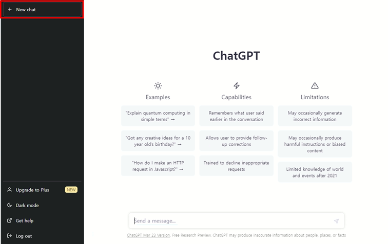 쳇GPT의 첫 화면 입니다. 쳇GPT 사용법은 간단합니다. 왼쪽 상단에 보이는 New Chat을 클릭하거나 가운데 하단에 있는 Send a message에 질문이나 글을 입력하시면, 입력된 질문에 따라 쳇GPT가 답변을 해줍니다.