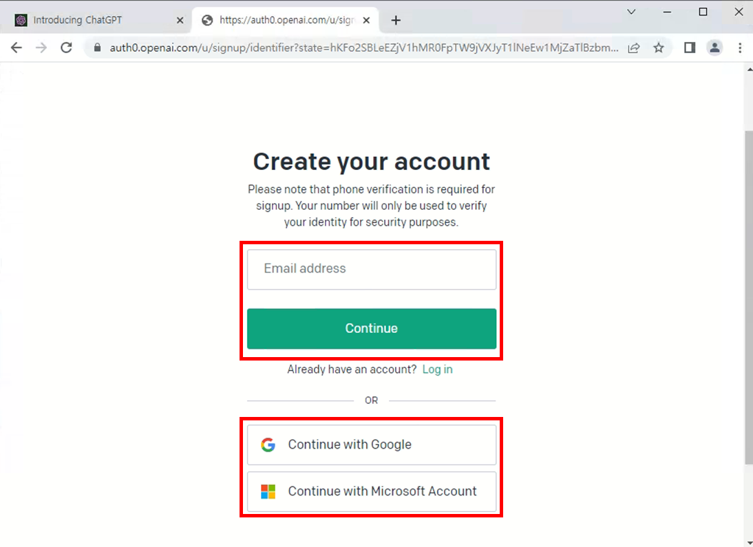 홈페이지 왼쪽 하단에 있는 TryChatGPT를 클릭하고, 로그인 또는 회원 가입 화면에서, 회원가입 절차를 진행합니다.
